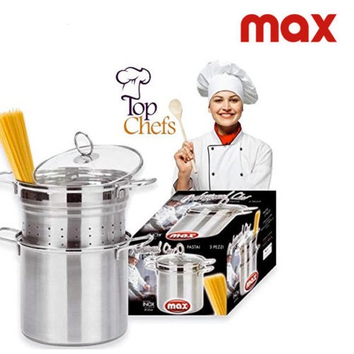 Set 3 pezzi pastaiola in acciaio inox spazzolato, triplo fondo capsulato, diametro 22 cm, capacità 6 litri. con coperchio in vetro temperato e pomello in acciaio, cestello inox con 2 manici.