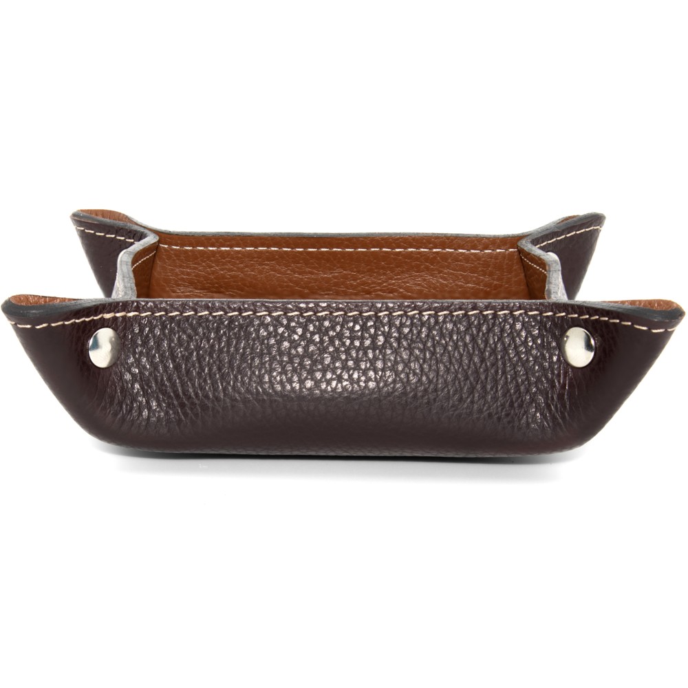 Molto bello ed elegante di colore marrone esternamente e cuoio internamente con cuciture chiare che danno un tocco di particolarità, con bordi tinti e chiuso con rivetti a pressione nickel free, con le seguenti misure 170 x 170mm la parte più larga con un altezza di 35mm, mentre il vassoio interno misura 130 x 130mm x 35mm, essendo in vera pelle da un tocco di classe in qualsiasi stanza oppure in ufficio sulla vostra scrivania, e si sposa sia con arredamenti classici, che moderni.